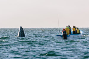 The trip offers guided whale encounters aboard small panga boats led by local experts, along with interpretive conversations with conservationists and marine scientists about current challenges facing gray whales and coastal ecosystems. Participants stay at an environmentally sensitive camp designed to minimize impact while providing an immersive wilderness experience.