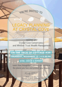 Join Crystal Cove Conservancy and Whittier Trust Wealth Management for an ocean view reception on our deck of Cottage #34. Learn how thoughtful planning can preserve the places you love and protect your legacy.